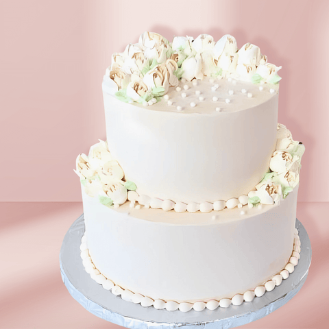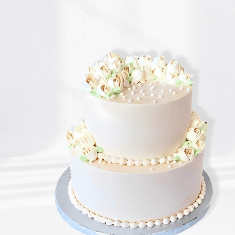 Celebrate your love with our sumptuous two-tier wedding cake, adorned with beautiful delicate flowers on top. Let this memorable cake be the highlight of your special day and impress your guests with this exquisite floral creation.
